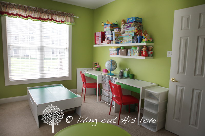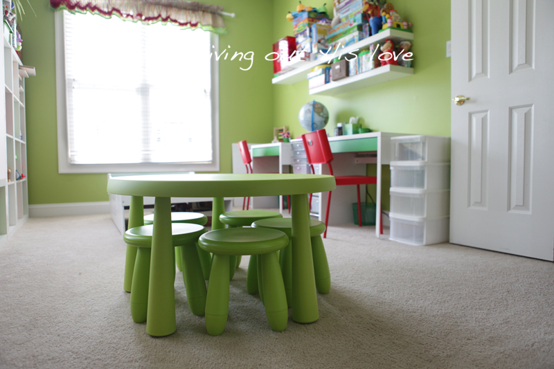 This kiddie-sized green table and stools are for Sunshine and oh man, she loves having furniture that’s her size! She also really loves the little book shelf/bench under the window – my mom is going to make a nice coordinating cushion for that too.