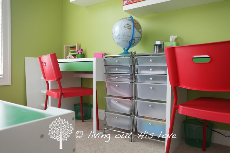 We are using a Workbox Organizing System this year … I like the simplicity, so I’m hoping it works for us. The drawers in the middle of the desks are the kids’ workboxes, I got them on sale at Michael’s for about $60 total.