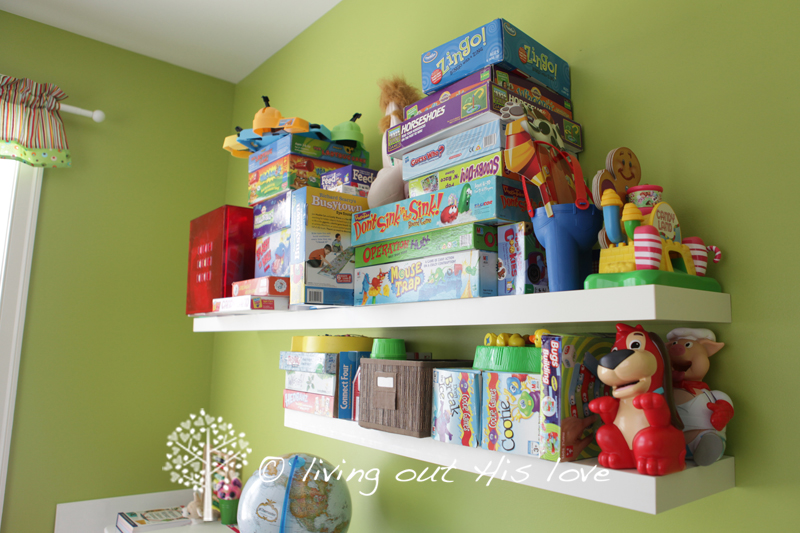 Our game shelf was already here. It’s wonderful to keep all of the little pieces to games out of little hands, but still easily accessible.