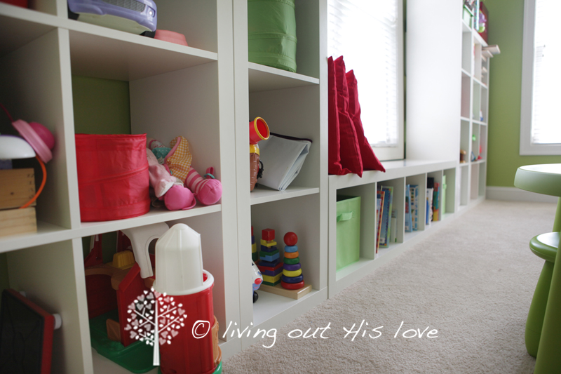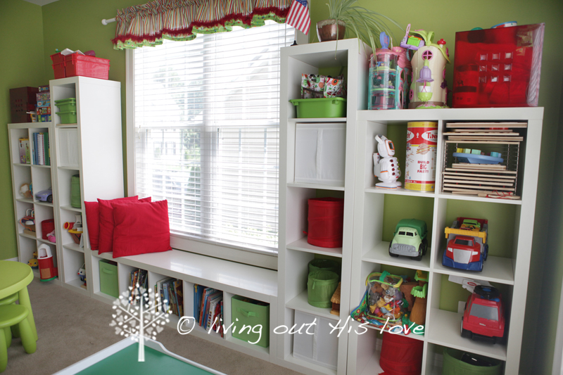 We already had the train table (which is so multi-functional, I just had to keep it in here) and the shelves for the games. We also had some of the plastic drawers. Aside from the fabric for the valances, just about everything came from Ikea, in case you couldn’t tell 🙂 And speaking of the valances, I have to brag a little because I am sooo not a sewer … so if I can make these, anyone can!