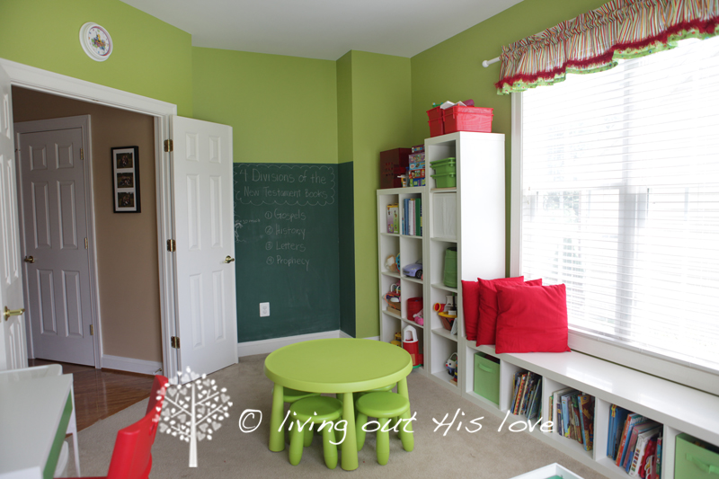 What a labor of love this Homeschool Room was! I am seriously tickled with the results and just love how happy and cheery it is. This also functions as our Playroom, so I needed lots of storage, (although many of the bigger toys found new homes around the house). I know that we do not “need” this room to do homeschool. But I also know myself. And I know that if we do not have a separate place to get away from the house and get our homeschool on, that I won’t be as diligent. I justified the cost because overall, we are saving a lot of money by not private-schooling our kids this year. Not including a few things (seriously, just a few) that we already had, this Homeschool Room makeover was about $850.
