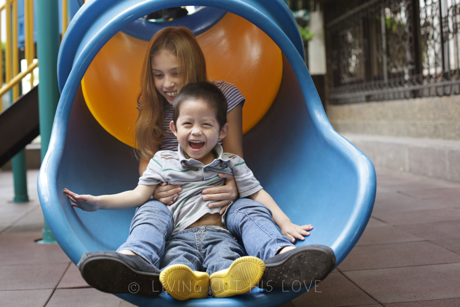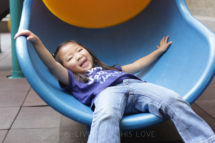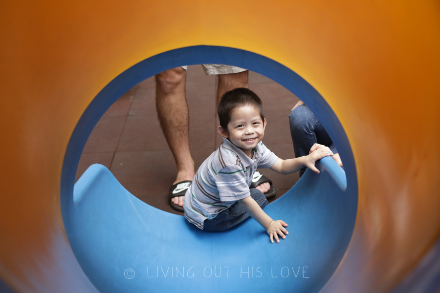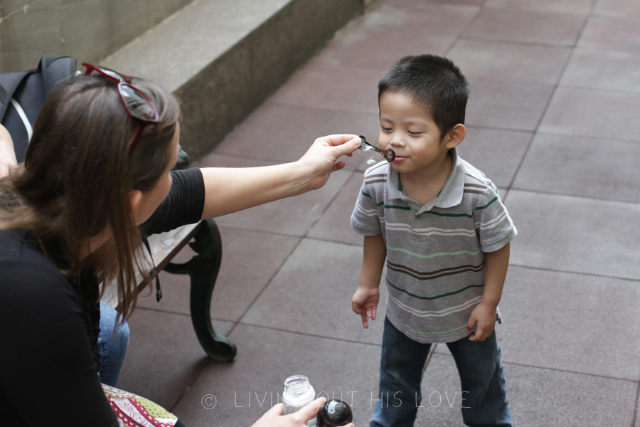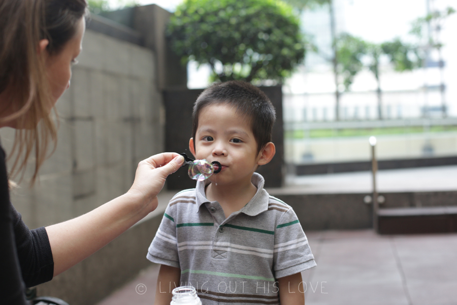 We had nothing planned for today, so we tried to do a few things to fill up the day. One of those things was a visit to the playground in the hotel. I was told that Dumpling’s favorite toy was the slide – an indoor slide in the orphanage playroom. They certainly knew him well! His eyes lit up with joy every time he slid down! We also taught him how to blow bubbles, so fun!