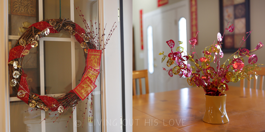 - Make a wreath with some hóng bāo (laminated to last longer), red and gold ribbon, red berry garland, and Chinese-themed garland.