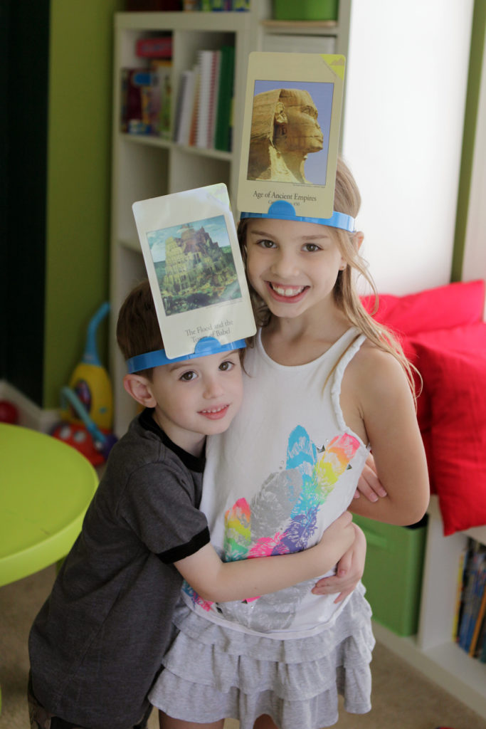 Coming up with interesting and FUN ways to memorize the CC material has been interesting. I’m mostly focusing on the Timeline material right now, although we still have work to do in the other subjects too! We absolutely love the Timeline Song and all the motions that go with it … so in order to make sure we had all of it nailed down, this morning we played “Timeline Hedbanz.” I give most of the credit to Angel – she’s the one that suggest Hedbanz, and then I put the rules together. There are many ways families could potentially play. But this time, we used the Timeline Cards for the historical events and then acted out the motions for clues so that we could then guess which event we had on our heads. It was a hit. And I can see this game being way more fun when we have more cards to play with!