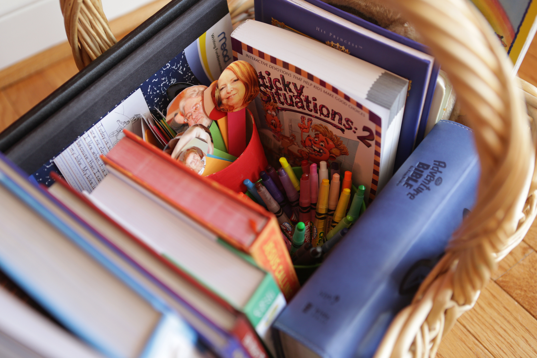 There are a variety of devotional books for kids so they have a choice each day, as well as an Adventure Bible to look up verses, several other books (I’ll outline them below), and a few Sunshine-proof board books. Some of these books were purchased just for our basket, others we already had. I realize our basket has a lot of different books and that certainly isn’t needed, but I know my kids like variety 🙂 I also included our Prayer Sticks, journals for the older kids, and crayons. I may add a “journal” for Sunshine also because she has really enjoyed drawing during this time. They pick their own devotional book in the morning, find the verse in the Bible, and then write/draw in their journal afterward. I’ll also pick from one of the other books to read or pray … still working that out but I just adore having this time with the kids! It’s very much mommy-led at this point and I am totally fine with that. I love sharing God’s Word with my children and consider it such a gift. Jesus’ love and grace for us is the most important life lesson I could possibly pass onto them, and what an honor it is to do that!