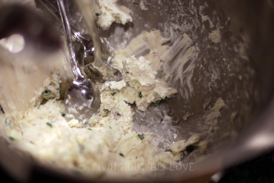 - After that, combine the green onion, crab meat, cream cheese, and Old Bay (if you're adding it in) together in a bowl with a hand mixer. Make sure it's mixed well.