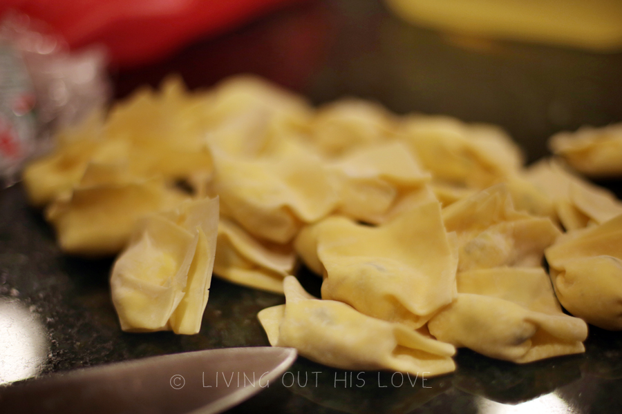 - Repeat this process for each wonton until your filling is gone or you've used all the wrappers. Several helpers make the process go faster!