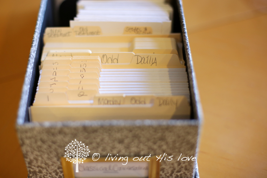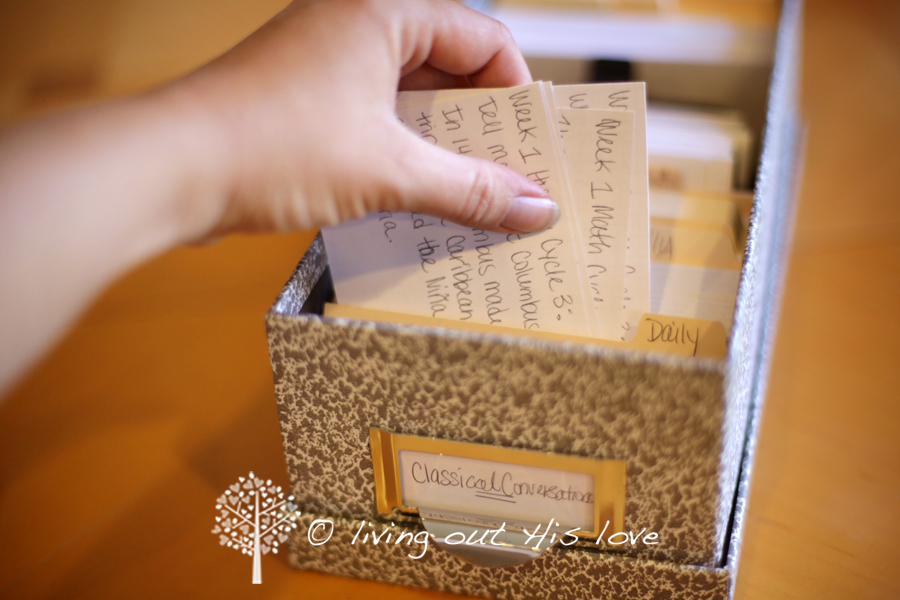 Yes, I did write out all of the memory work individually on index cards. It is time consuming, but I’m through Week 12 in Cycles 1 & 2. I have a little bit further to go, but I’m almost there. We work on Timeline separately with the song, so I chose not to add it into the weekly tabs. I am using a large box so I can keep our scripture and Bible books memorization in separate tabs behind the CC material. And for later, I have flashcards of the states & capitals printed and ready for review. We’ve been using this memory box method for the past week and it’s working pretty well so far. It’s not fancy or super fun, but it gets the job done! I fell off the memory work bandwagon after my China trip in March and then working on adoption paperwork, so I am really excited to see how the Memory Box system works for us.