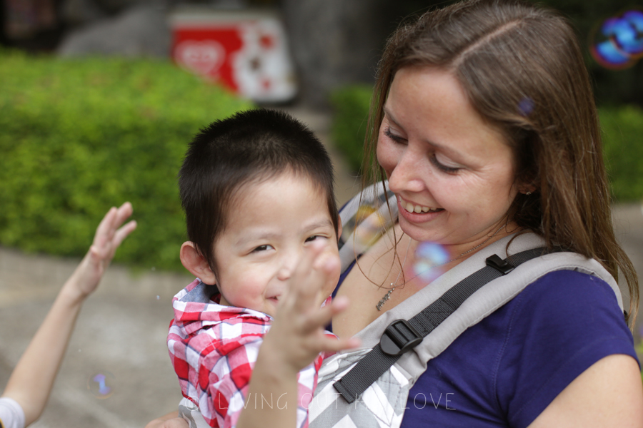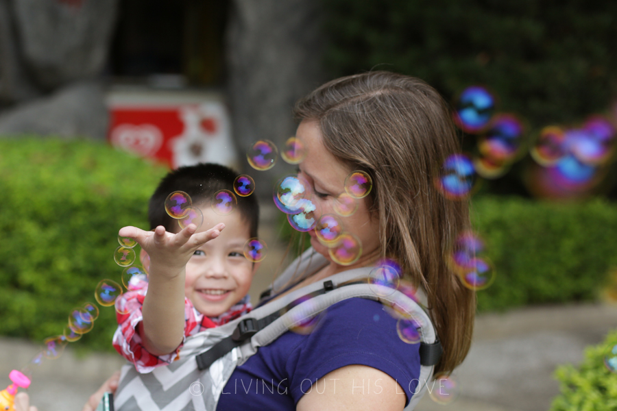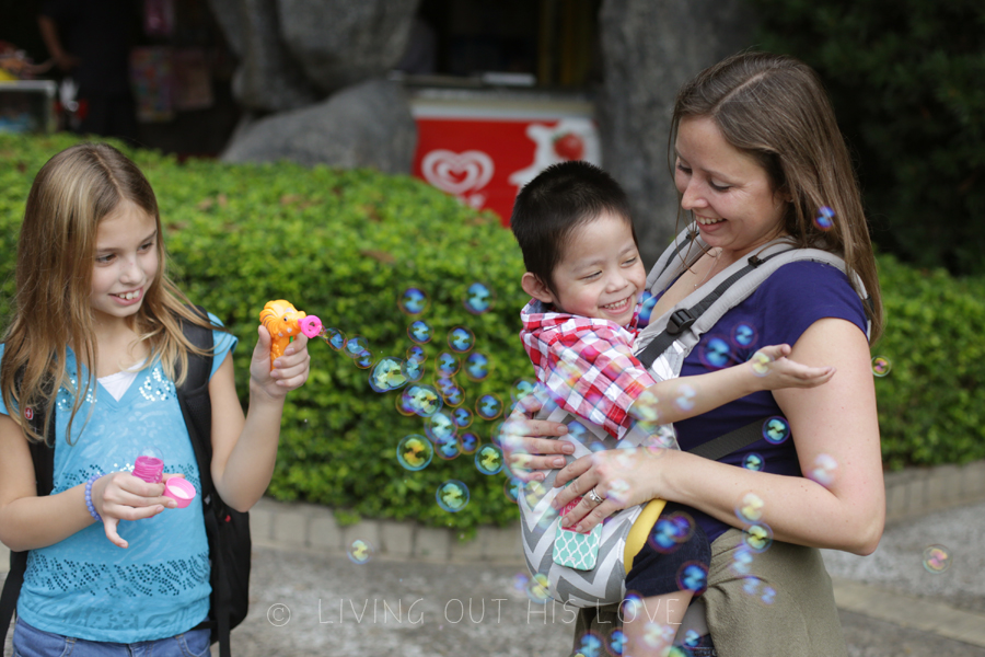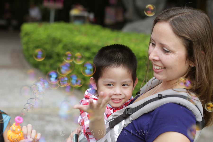 We visited a local botanical garden this morning – a fun way to get out and celebrate our 11th wedding anniversary! It was a fun place – lots of interesting things to look at. A few of the children in our group also got bubble guns, which Dumpling just absolutely adored. The utter joy in his face just made us so happy. He squealed with delight as he popped bubbles. It was priceless.