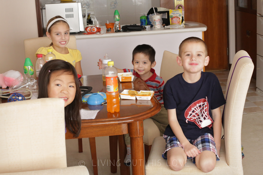 Tomorrow will be a difficult day all around. I am going to visit his orphanage alone while DH stays behind with the children. I had originally planned on taking the two big kids, but the 5 hours drive both ways has made us reconsider. I’ll be visiting with the orphanage staff and the children who live there, seeing where my precious son lived for the first three years of his live, and delivering lots of donations. It will be a tough trip filled with many emotions. Meanwhile, DH will be holding down the fort here at the hotel. It’s a long day to keep four children entertained period, let alone in a hotel without a car or any of our normal comforts. Please keep us in prayer – I leave for the orphanage at 6am (4pm home time on Thanksgiving). I am reminded tonight of how much we have to be thankful for. God is so good!