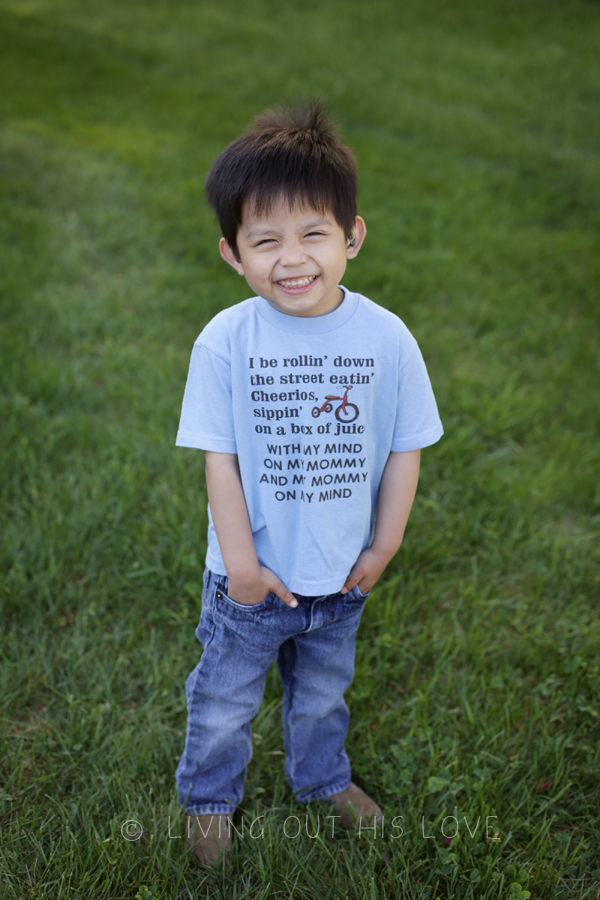Just for fun, I wanted to share pictures of my little guy in the hilariously adorable shirt. It was a “baby shower” gift from my dear friend before sweet Dumpling arrived home. I literally laughed out loud when I opened up the gift. And then when she explained why she decided on that one, well I laughed even more. DH loves all types of music, including the rap we listened to growing up (think Snoop Dog). So when she saw the shirt, she knew it was the one. It certainly is perfect for him, because mommy is on his mind all day long. I can’t even go to the bathroom without him sitting on the step stool next to me. Oh this boy. He sure does love his mama, and his mama sure does love him too. 🙂