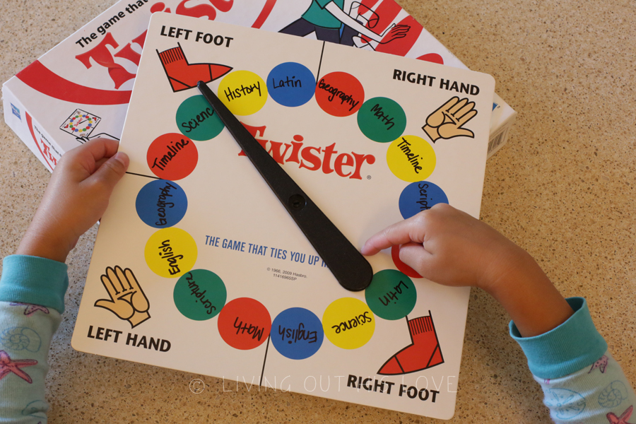 I also like that it’ll work regardless of how many weeks we have under our belts. We’ll just need to pick a week once the spinner lands (or before even). We may simply pick one or let a pair of dice decide for us. To create the game, I used a sharpie to write the review subjects on the spinner board. I assigned 2 circles to each subject. Although it looks like any version of Twister will work, I think the Classic Twister would be best to make the spinner board.