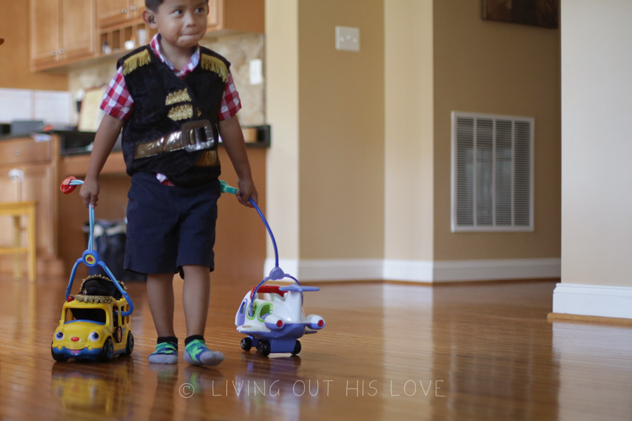 I took these pictures about a month ago and am sadly just getting to post them. When he walked out of the playroom to show us how he had picked up the little people toys, oh he was very proud. Completely tickled with his ingenuity. I could see the accomplishment beaming from his face. And I was pretty impressed too. He regularly pulls things apart (against my wishes) to figure out how they work, or tries to put odd things together to see what they’ll do. I don’t always love the results (especially when things break), but I do love watching him work!