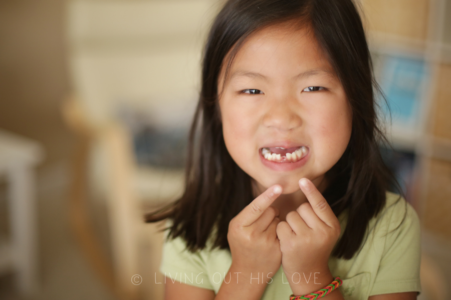 Her first loose tooth is officially lost! Daddy was tickling her at bedtime last night when it popped right out! So fun and she was absolutely ecstatic! She’s been working on it day in and day out, for a few weeks now. Seeing the fruits of her labor made her so proud and as you can see, she’s simply beaming with delight. Adorable.