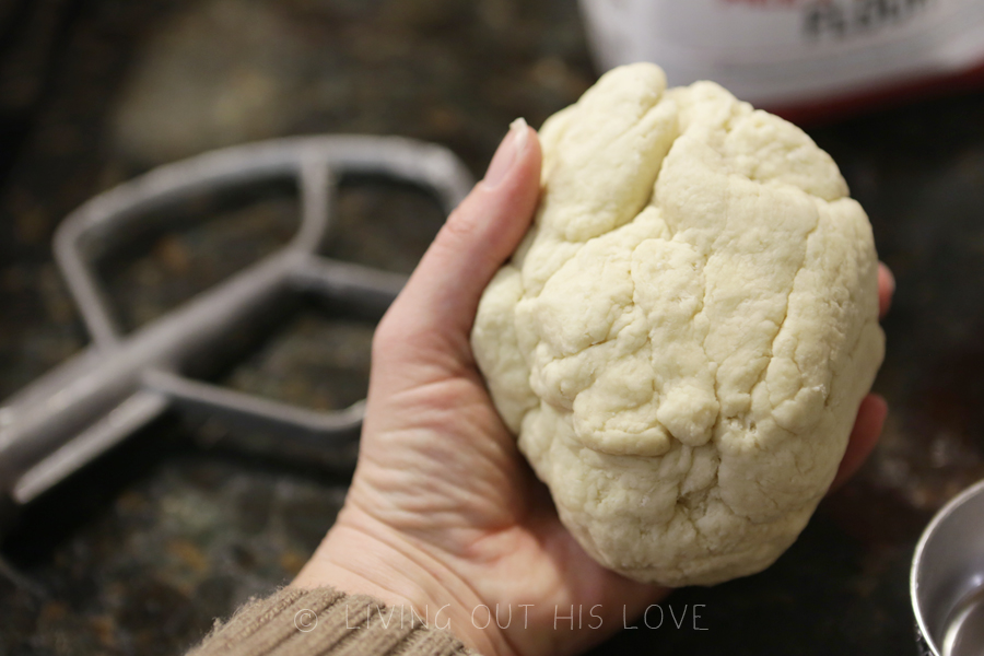 2. Cut off a small ½-ounce piece of dough (you will need to use a kitchen scale) and roll into a ball. With your hand, flatten the ball on your work surface to make a circle.