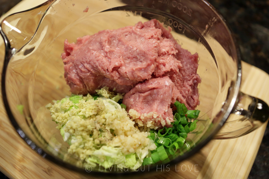 Put 2 cups of flour in a stand mixer while waiting for the water to boil. With the mixer going, slowly add the just-boiled water to the flour until a dough ball forms. Add more water or flour as needed to make a dough ball that’s not sticky. Knead the dough by hand for a minute (dough will be warm and somewhat rough), and then quickly place in a ziplock bag, making sure to squeeze out all the air before sealing. Set aside and let the dough rest for at least 20 minutes, but up to 2 hours. While the dough is resting, mix up the filling.