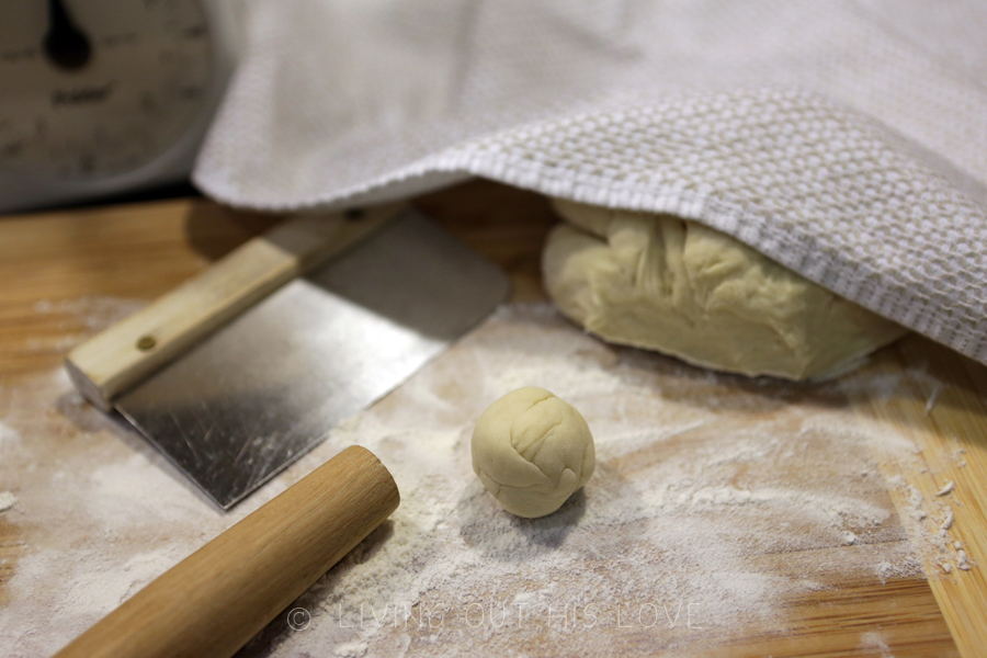 1. Take the dough ball out of the ziplock bag and knead it on a floured surface for a few minutes. The dough will be wet from the condensation in the bag, and will need a little flour kneaded into it. Place the dough ball on your work surface and keep covered with a towel to retain moisture.