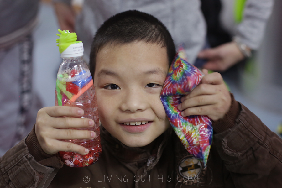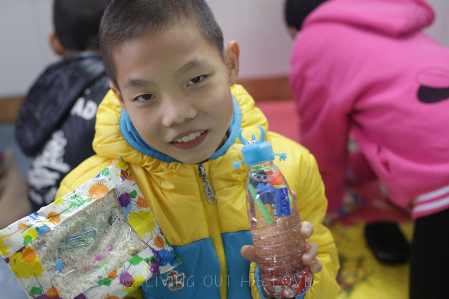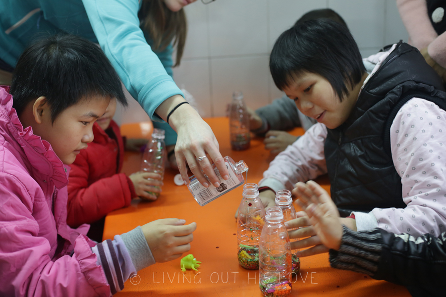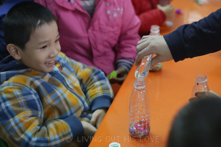 Yes, with 20 of our best xiǎo péng yǒu, we made sensory bottles. It was such a hit. It was also a little bittersweet because it was the last activity we did with them before saying goodbye. But seeing the sensory bottles in a video of their Spring Festival celebrations, weeks after we had been there, put a big smile on my face. Knowing they hold onto these bottles as sweet treasures gives me hope that they think fondly of us, too.