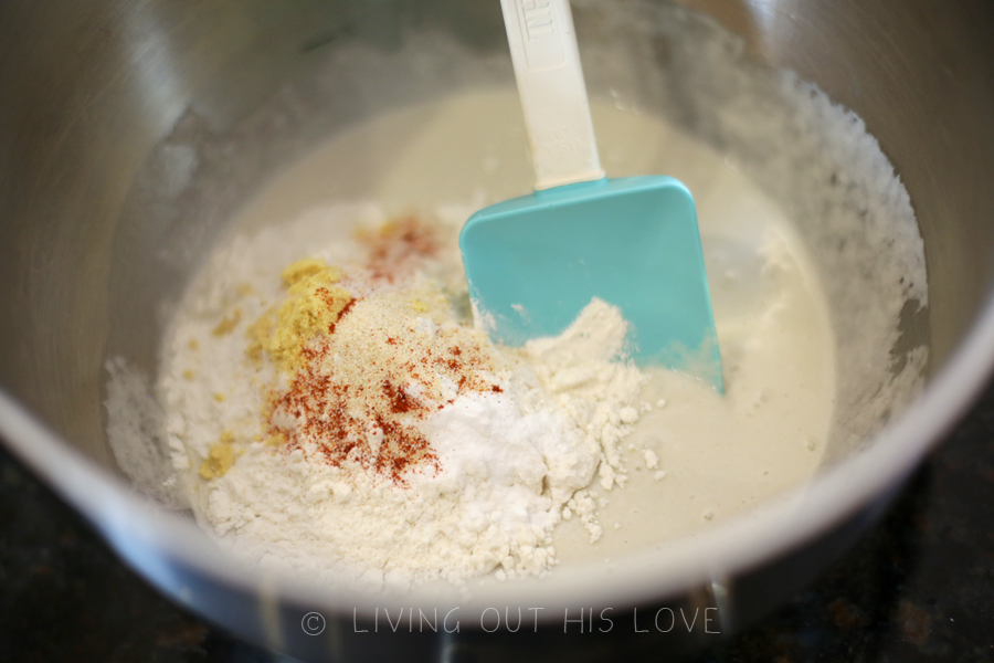 - Add 1/2 cup of the flour, 1/4 tsp baking soda, 1/4 tsp onion powder, 1/4 tsp dry mustard, 1/2 tsp sea salt, and dash of paprika.