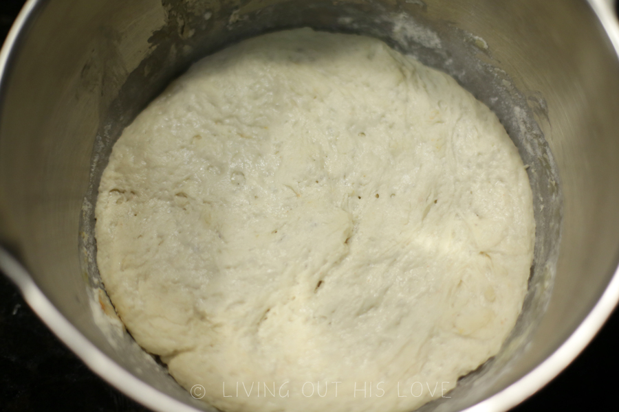 - Cover the bowl loosely with plastic wrap and let rise for 8-12 hours. I typically rise the dough overnight, which gives it a chance to roughly double in size.