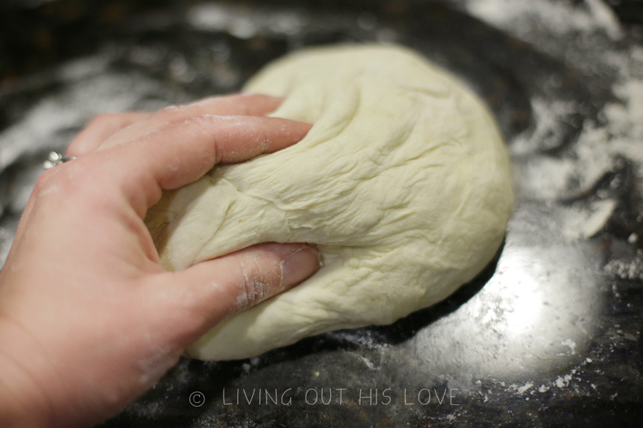 - Next, punch the dough down and knead for a few minutes, adding flour as needed so the dough doesn't stick to your hands or work surface.