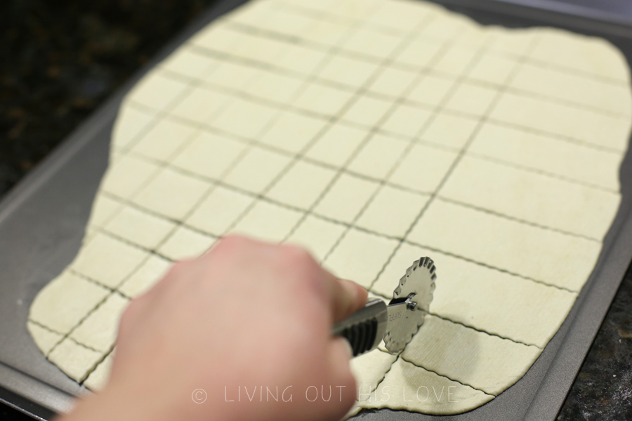 - Use a pizza cutter or pastry cutter to cut the dough into desired shapes, trying to keep similar sizes so the crackers bake evenly.