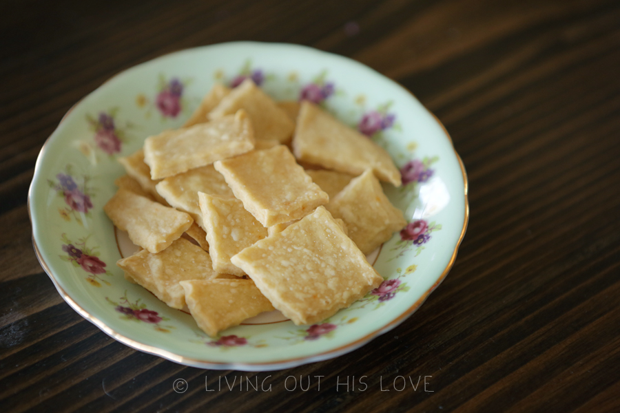 I need to start experimenting with different seasonings, but this version is just so yummy. It’s based on THIS recipe that I found on Pinterest. It does use unbleached white flour, which I realize isn’t the best flour option. But there are no chemicals or preservatives in the crackers otherwise. Just real ingredients. One day I may try experimenting with other more nutrient-dense flours. This recipe is such a big winner for us though, so I’m keeping it as-is for now.