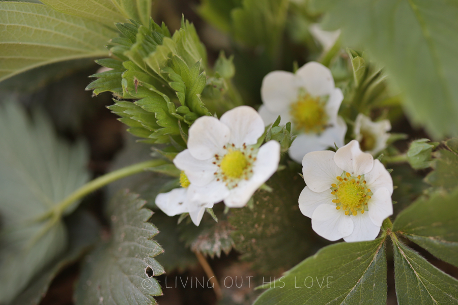 Believe it or not, a few of the blueberry bushes now have tiny baby blueberries growing on them! And the strawberry plants are also starting to flower as they really begin to spread out! I allowed a generous area for them to grow, especially because I’ve heard they have a tendency to take over. The kids are so looking forward to tasting juicy strawberry treats from “the patch” this summer!