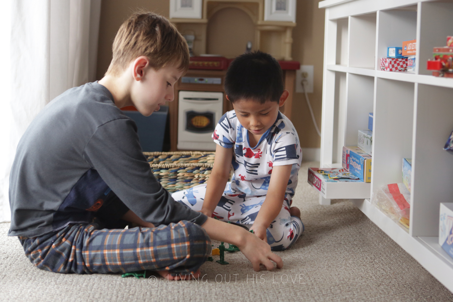 I do really try to soak in the moments of sweet togetherness though. And when I glimpsed across the room to see the boys gently playing together the other day, it was instantly another one of those make-my-heart-leap-with-joy moments. They weren’t doing anything particularly special. Just sitting in their pajamas playing with army men was an ordinary enough sight, but one that was beautiful to me.