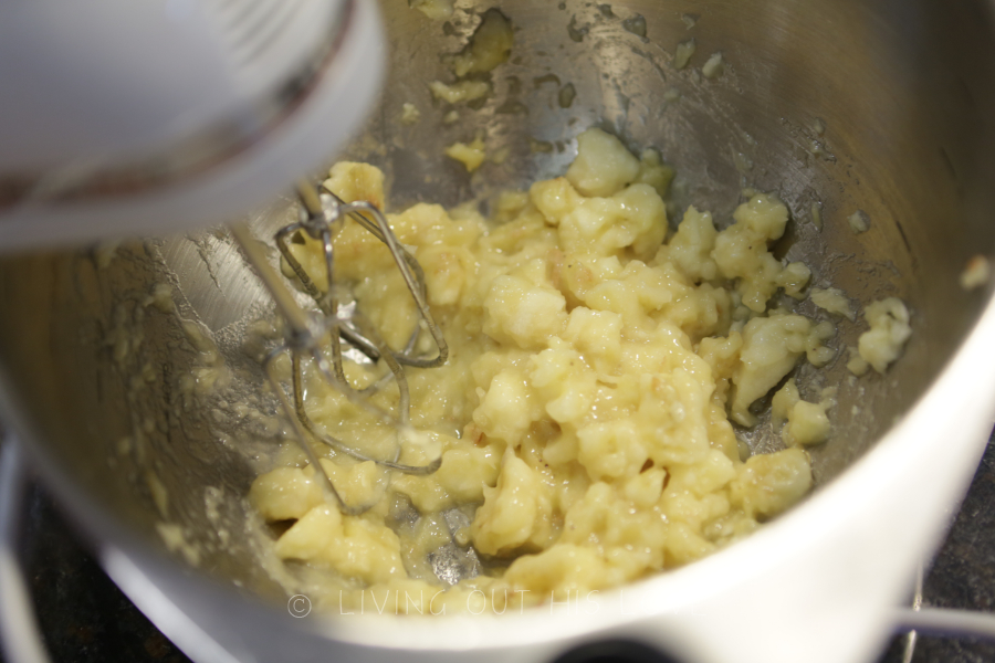 - Peel and mash the bananas in the bowl with a hand mixer.