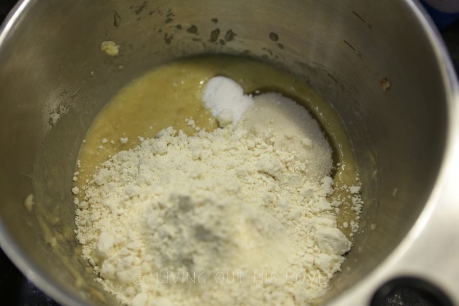 - Add the sugar, flour, baking soda, and sea salt. Mix well.