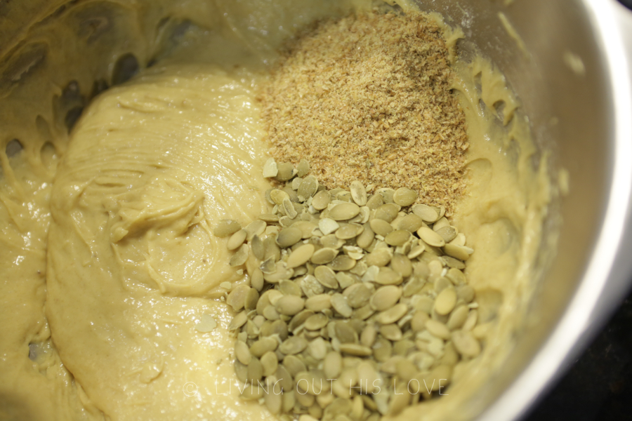 - Add the ground flax seed* and pumpkin seed* if you want to add them. Mix well.