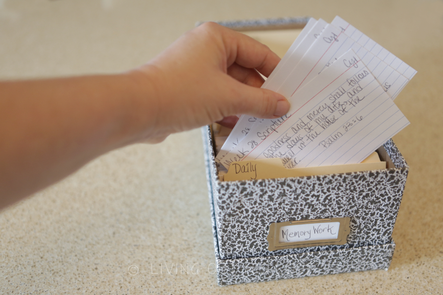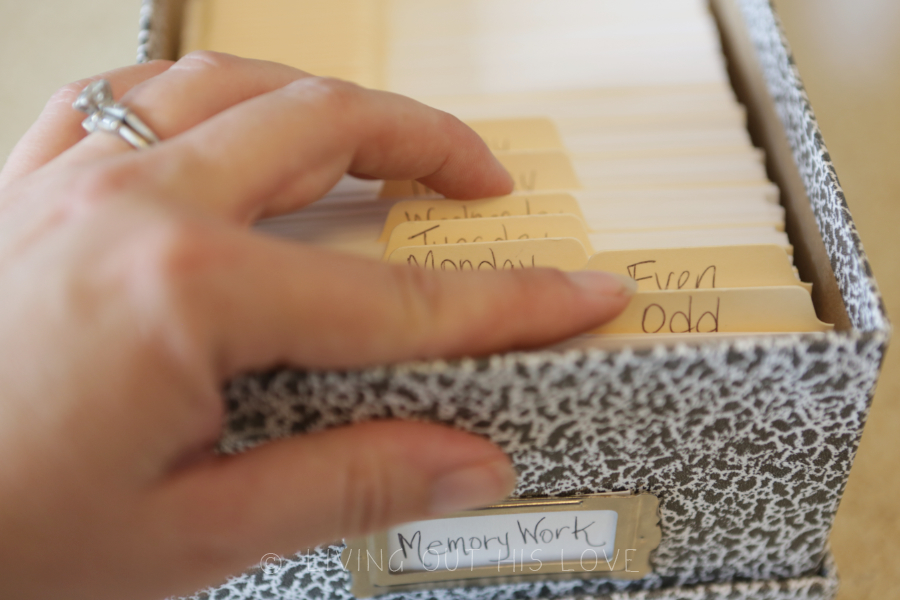 I keep the weekly schedule taped at the back of the box for a quick reminder. With multiple subjects, I can sometimes get confused about what we’re reviewing for the day. Toward the end of the school year, this memory work review system does get lengthy. But it’s the only way that has worked well for us to actually do it. We’ve done all the cute games, and while they’re fun, we just aren’t consistent with them. The memory review box works into our morning time together, and the children all know to expect it. We keep crayons, coloring books, playdoh (or slime right now with it being all the rage), legos, etc. in close proximity so everyone stays engaged. The goal with this memory review system isn’t complete mastery (although that’d be great!), but the children do end up picking up a large portion of our memory work from the sheer number of times we review. Even my littlest guy, who hasn’t formally studied memory work yet, happily hums along to many of the songs.