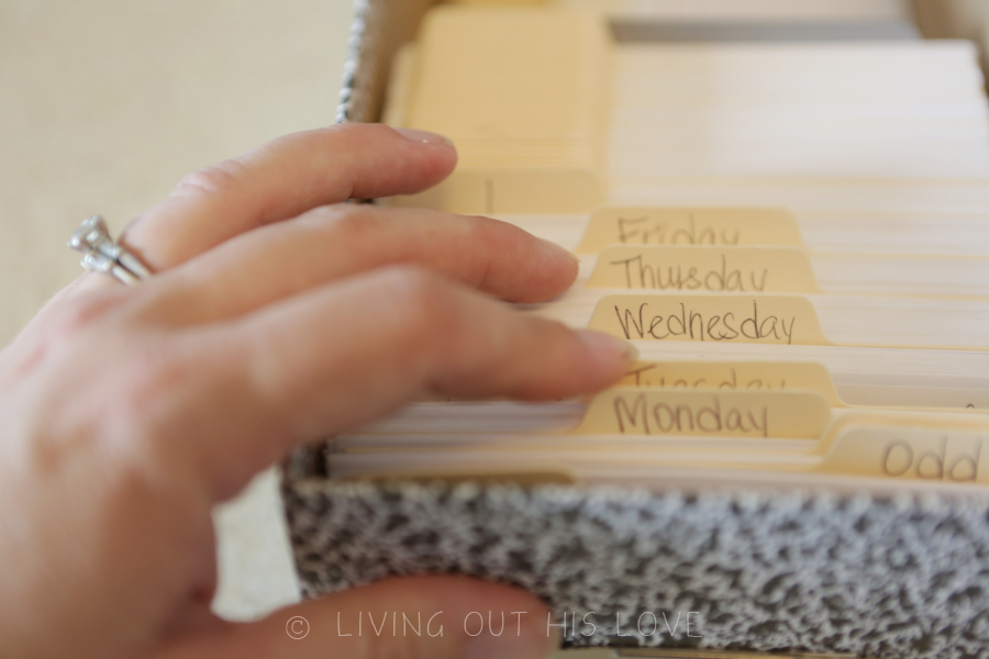 Each day, memory work is reviewed from the daily tab, the even or odd tab (depending on whether the date is even or odd), the day of the week tab (depending on which day of the week it is), and then the numbered tab (corresponding with the date). I use the memory songs for review most of the time, unless it’s a sentence that we know so well that the music simply isn’t necessary. I should note that on our all-day community days (Monday), we listen to the memory work in the car. And on Thursdays (our half-day community days), we do memory review after lunch instead of in the morning.
