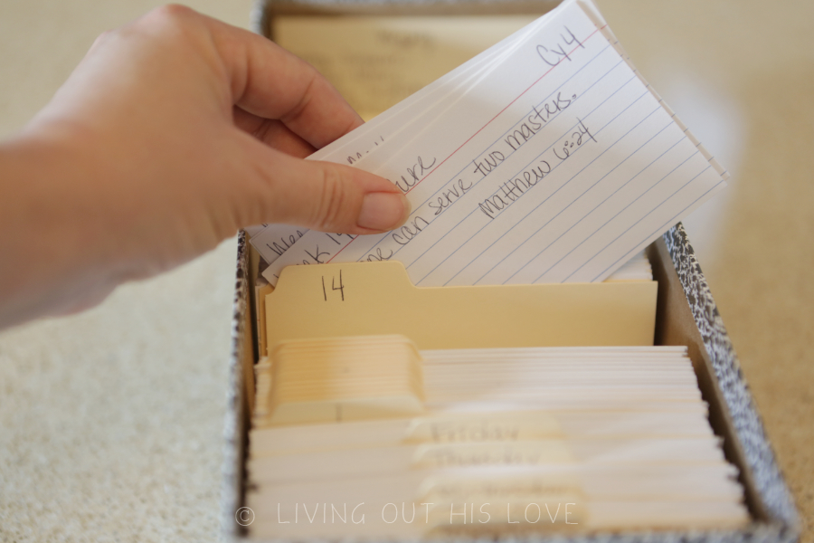 I’m in the thick of homeschool planning for our third year with Claritas memory work, so it seemed like a perfect time to update the blog’s memory work box post! This isn’t an idea unique to me. It is adapted from the Charlotte Mason scripture memorization system. This method is a fantastic way to systematically review memory work because it makes sure you don’t miss anything. It’s not exciting or flashy, but it does work.