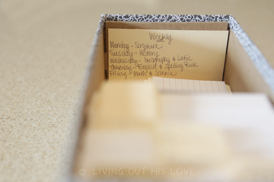 I originally adapted it for our studies with Classical Conversations, but I overhauled it when we started our private co-op using the Claritas material. I utilize a large 3×5 index card storage box along with index card dividers to keep everything organized. The set-up is similar to our old version, but with a few changes to make it work for the Claritas material.