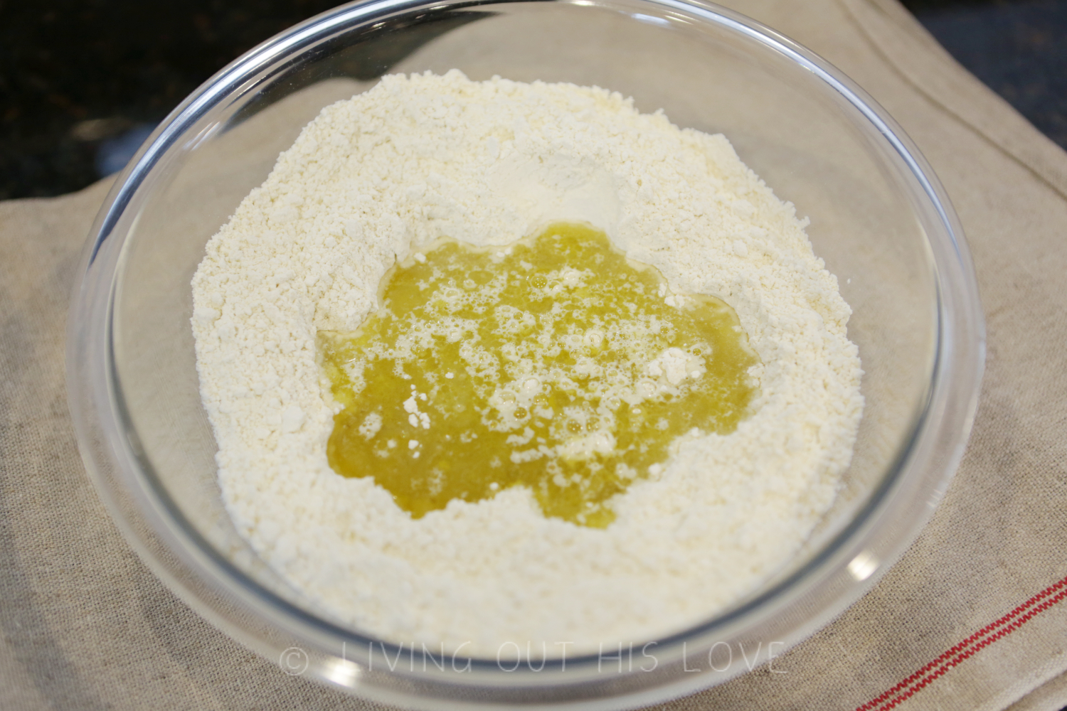 - Create a small indentation in the middle of the flour mixture. Add the extra virgin olive oil and hot water.