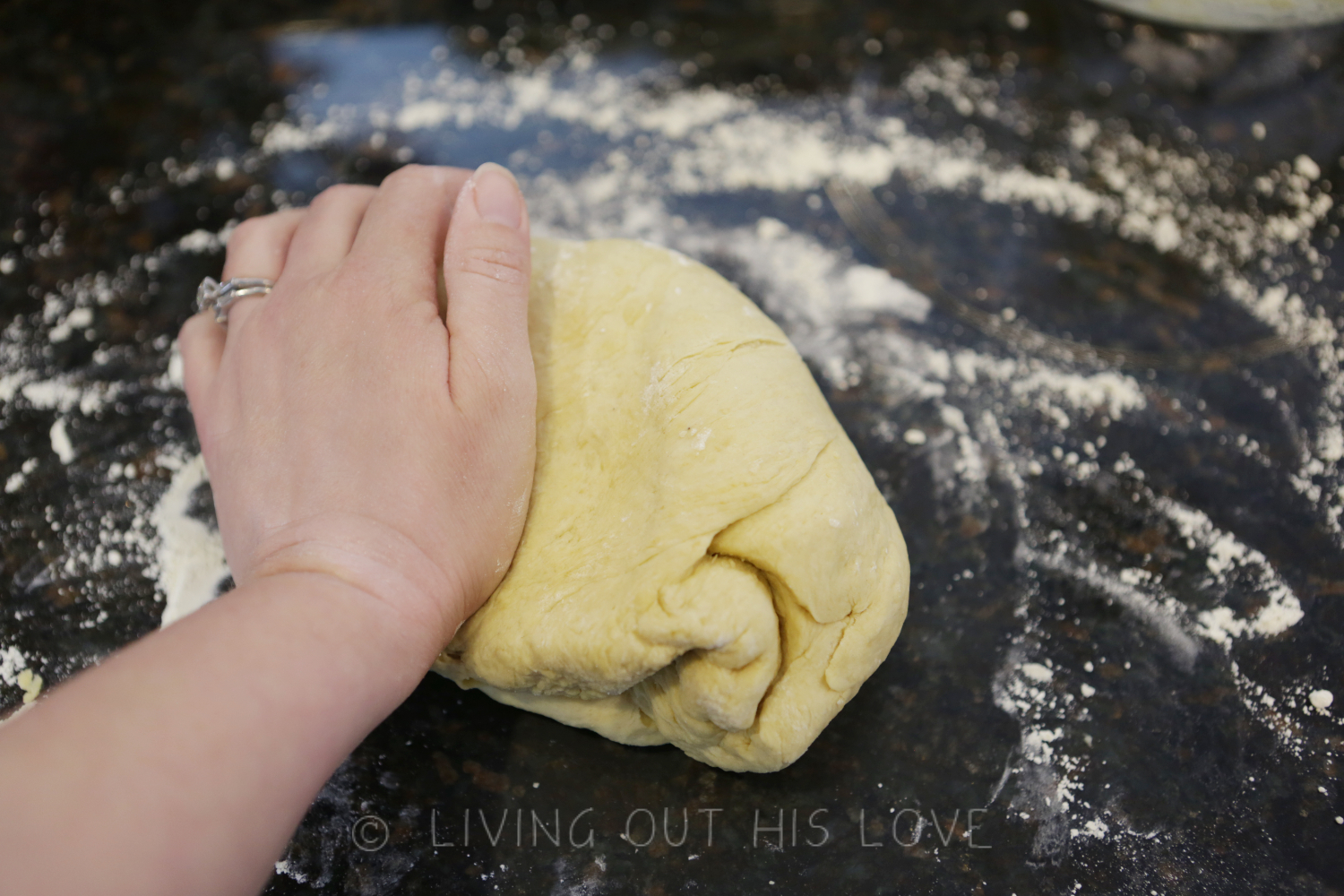 - Turn dough out onto a liberally floured surface. Knead well, incorporating more flour as needed to make a dough that is workable.