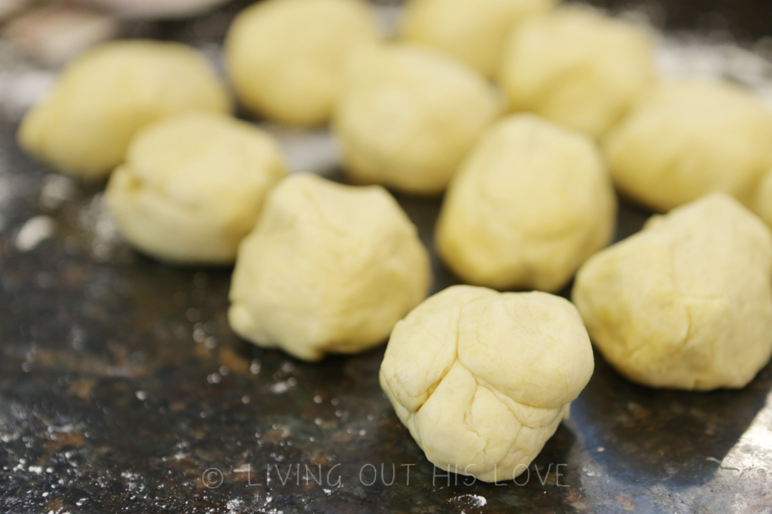 - Cut off 12 equal dough pieces, approximately 2 ounces each (I use this kitchen scale), and roll into balls. Let sit, covered, for at least 30 minutes to make the dough more workable.