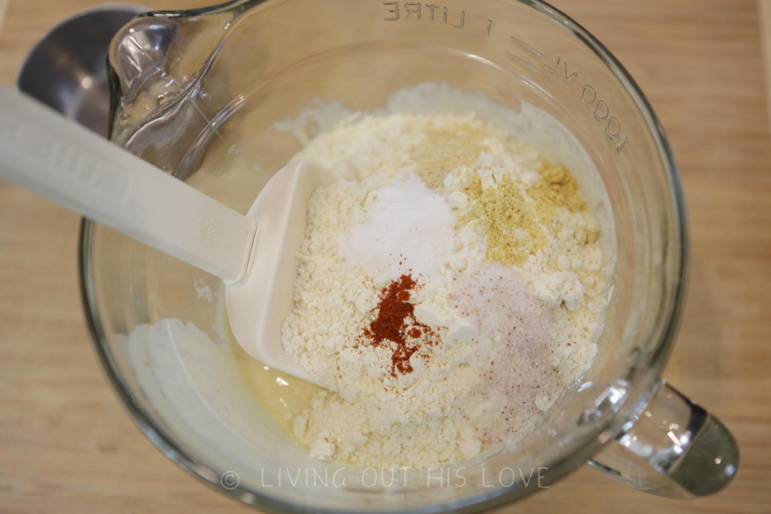 - Add 1 cup of the flour, 1/2 tsp baking soda, 1/4 tsp onion powder, 1/4 tsp dry mustard, 1/2 tsp sea salt, and dash of paprika. Mix well.