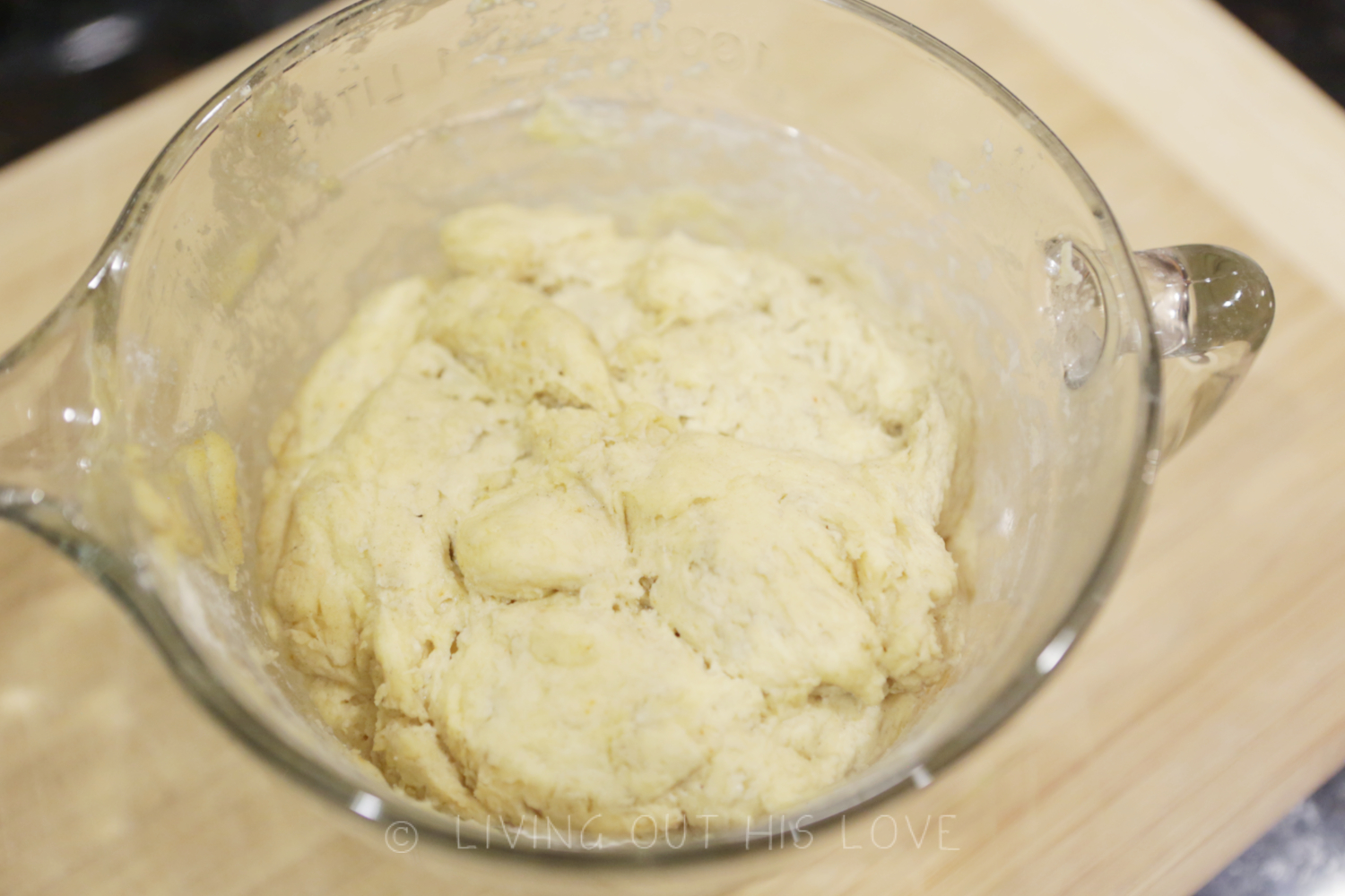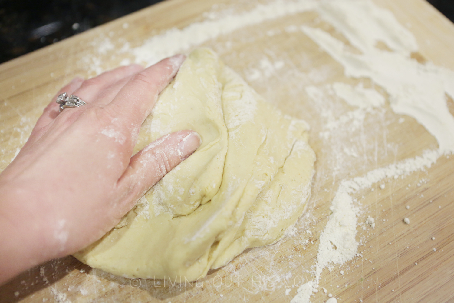 - Add enough extra flour to make a dough that's slightly sticky. It should be just enough flour to bring the dough together. I do all of the mixing with a spoon.