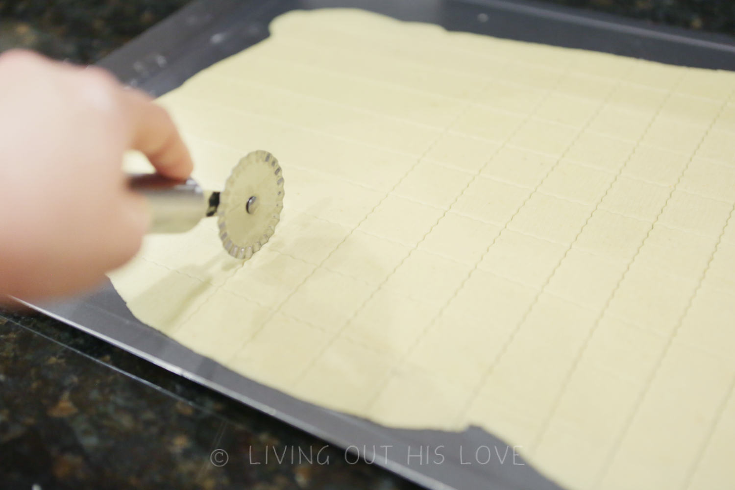 - Use a pizza cutter or pastry cutter to cut the dough into desired shapes, trying to keep similar sizes so the crackers bake evenly.