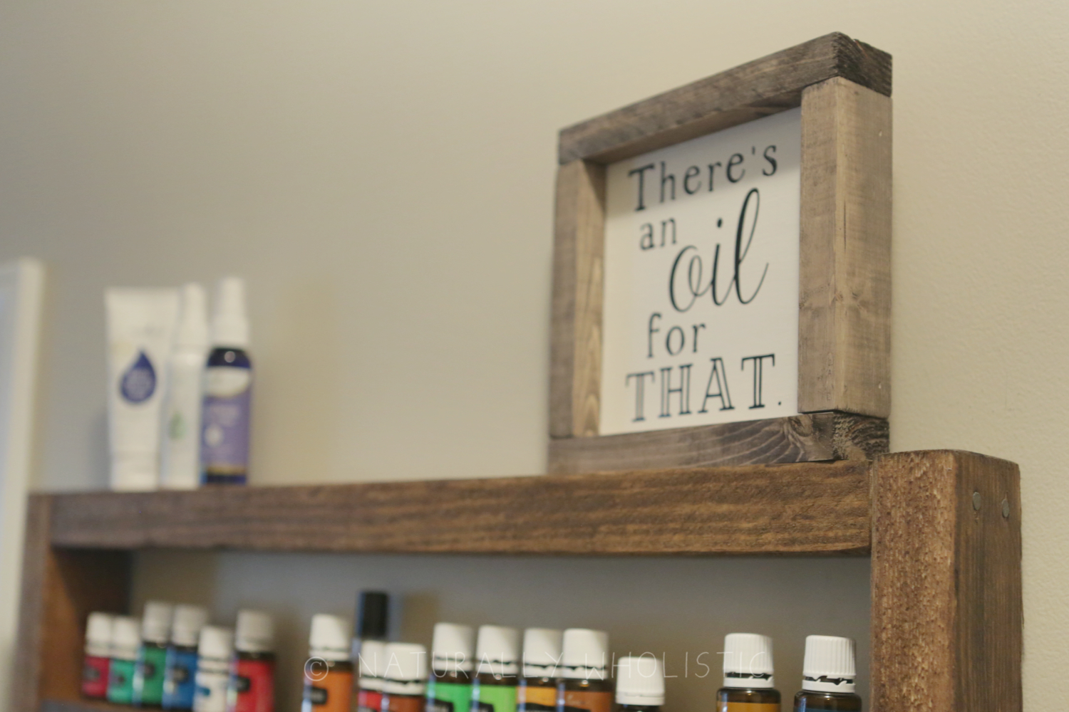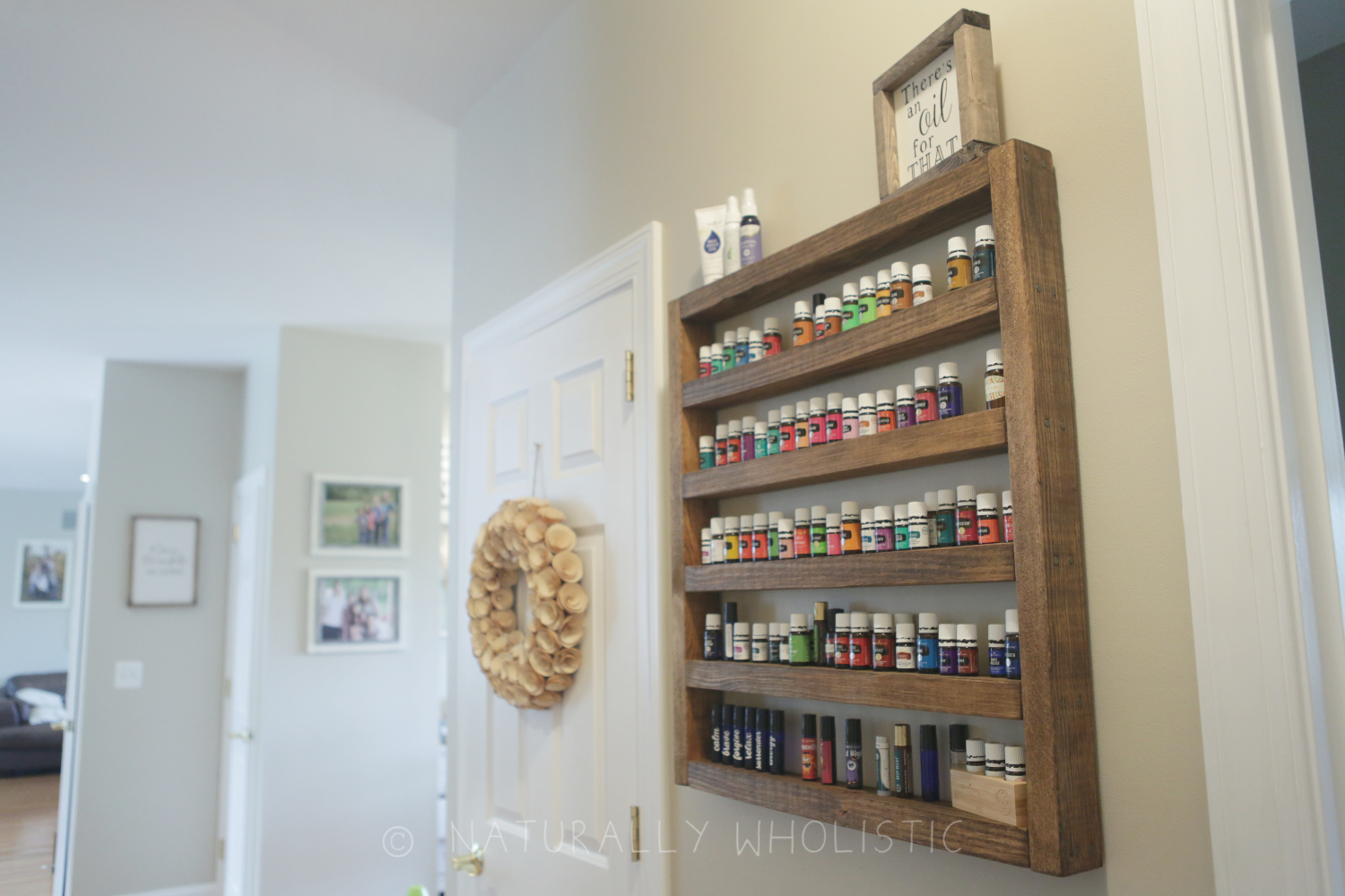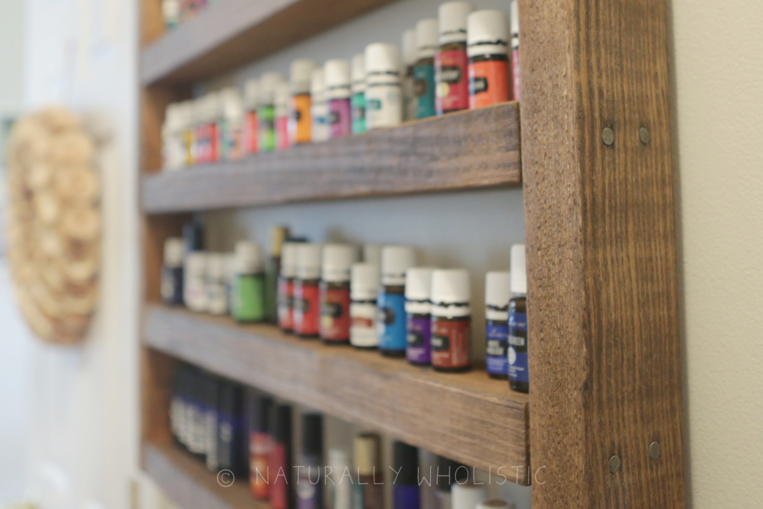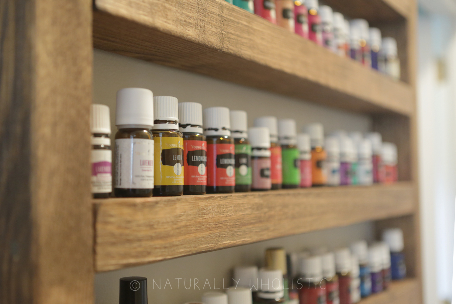 In trying to find a solution to my issue, I devised a rustic DIY essential oils rack creation in my head. I looked at all of my walls and labored over where I might display my vision. I eventually decided on a wall that’s in a dark-ish hallway, one that receives very little natural light. I figured that was a reasonable place to store my oils, and it’s also close to the kitchen where I spend most of my time.