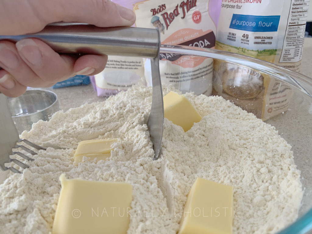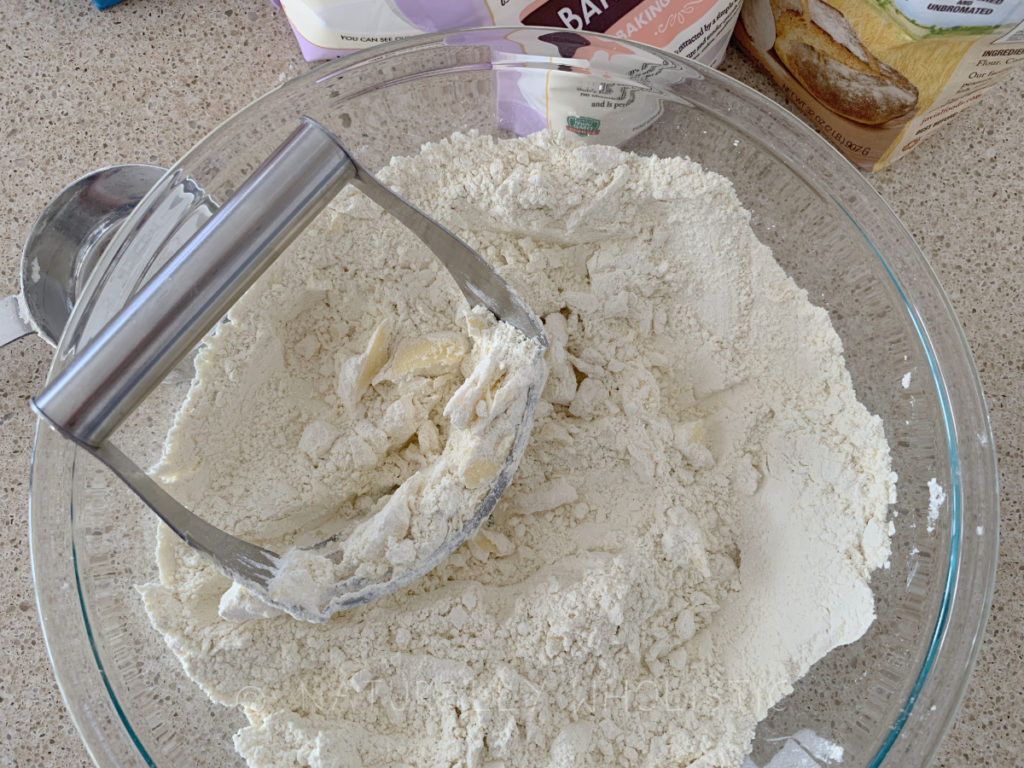 - Add the chunked butter and use a pastry cutter to "cut" the butter into pea-sized pieces. Don't spend a bunch of time making it perfect though, it's better to not overwork the dough.