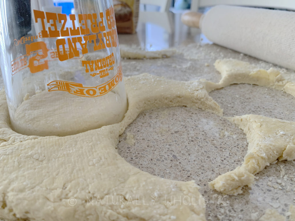 - Using a 3-inch round biscuit or cookie cutter (again, you could change the size depending on the desired outcome), cut the biscuits out of the dough to place on a baking stone. If you don't have a biscuit or cookie cutter, use a drinking glass. I did that for this post because I'm at the beach and don't have my normal tools.