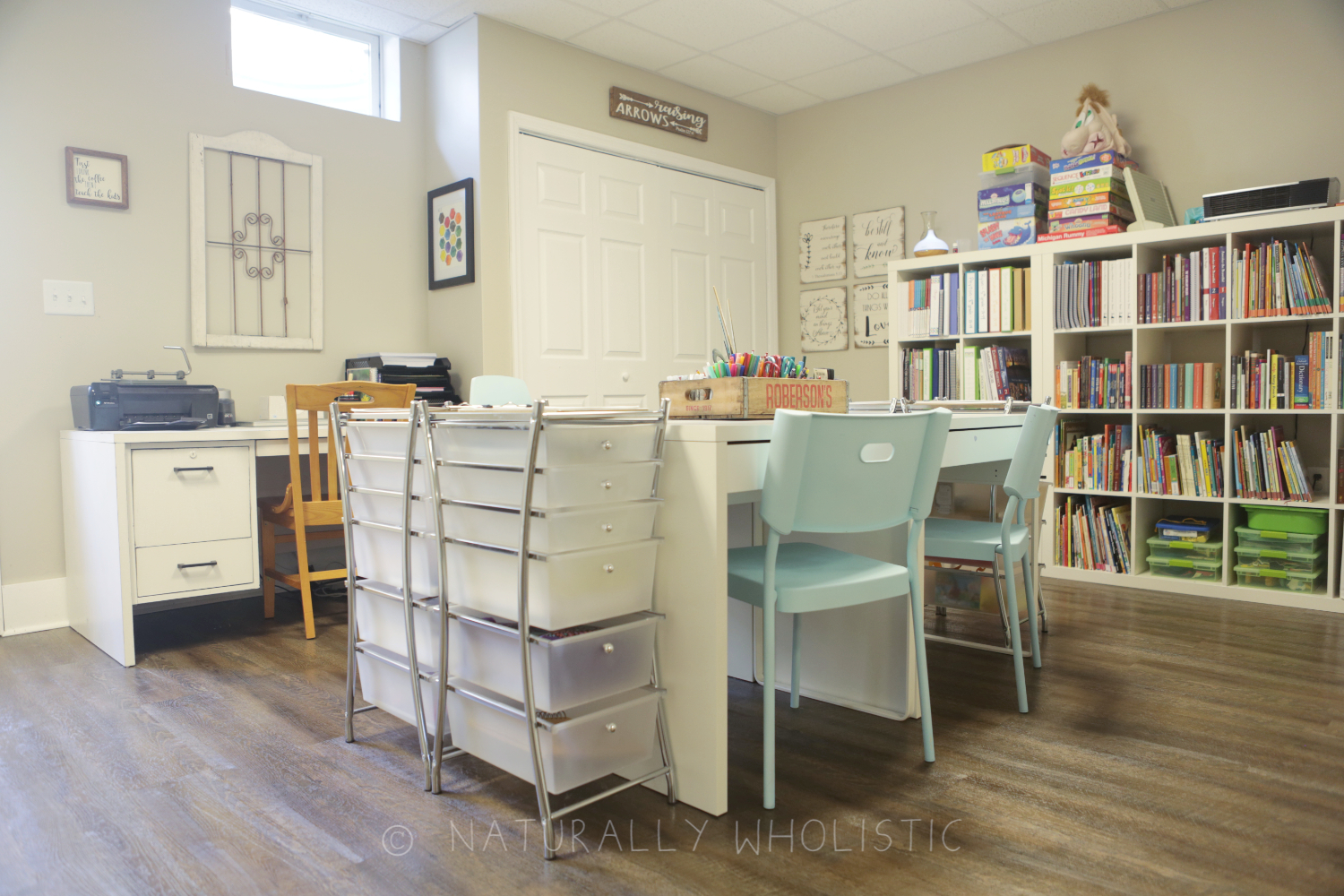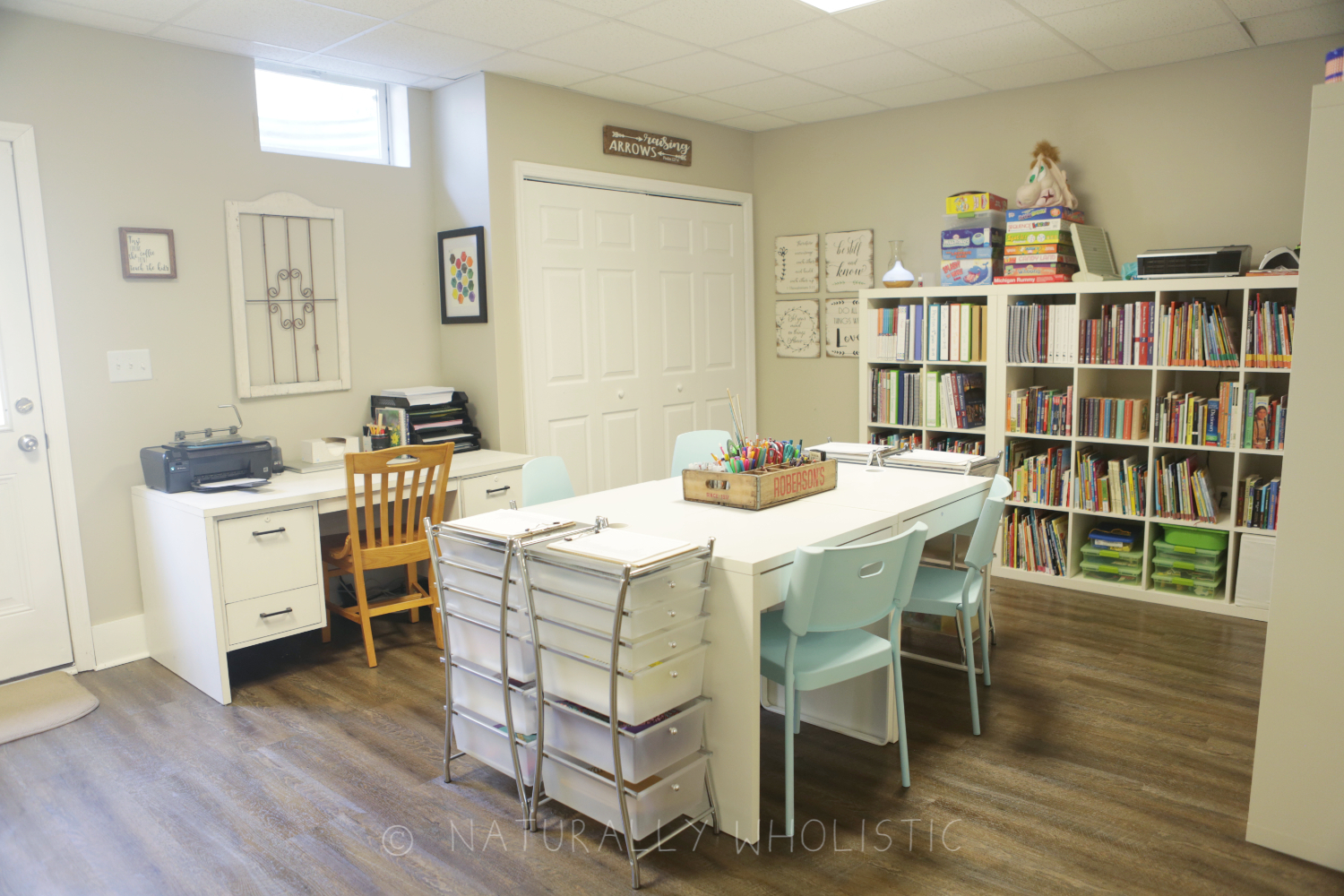 Because of that, we’ve always had a designated homeschool space. It has changed quite a bit since we first started schooling in 2012. OUR FIRST SPACE reflected the younger students I was teaching, with lots of color and lots of storage for toys. I was looking back through the pictures of that space with the kids recently, and we were all remembering the old toys and reminiscing about the simplicity of life back then. Such sweet memories. OUR SECOND ROOM was a result of our move to the country in 2015. I utilized all of the same furniture and supplies, but made it fit with the new area we had in the basement. It worked, but it felt overstimulating for the smaller space.