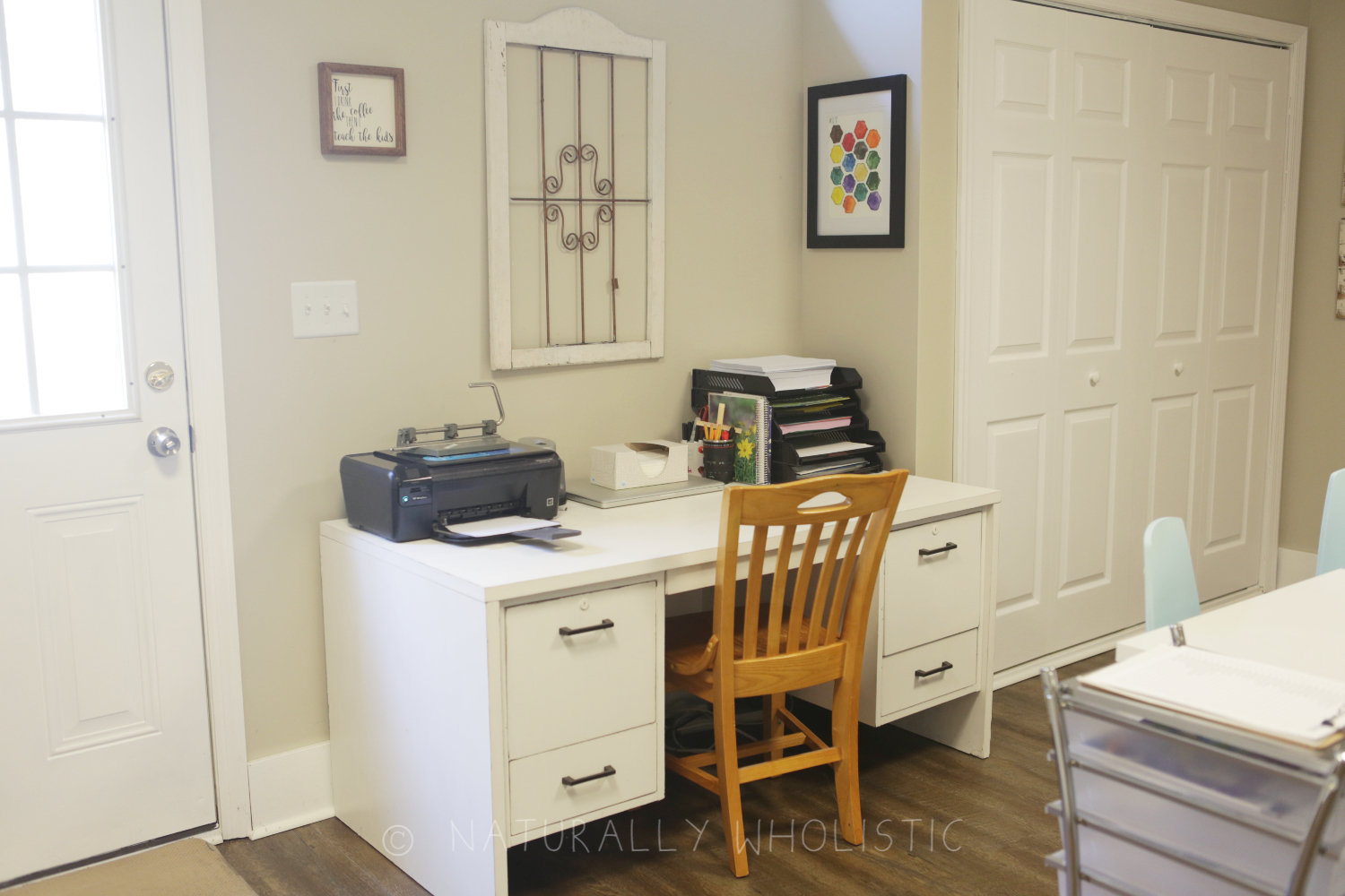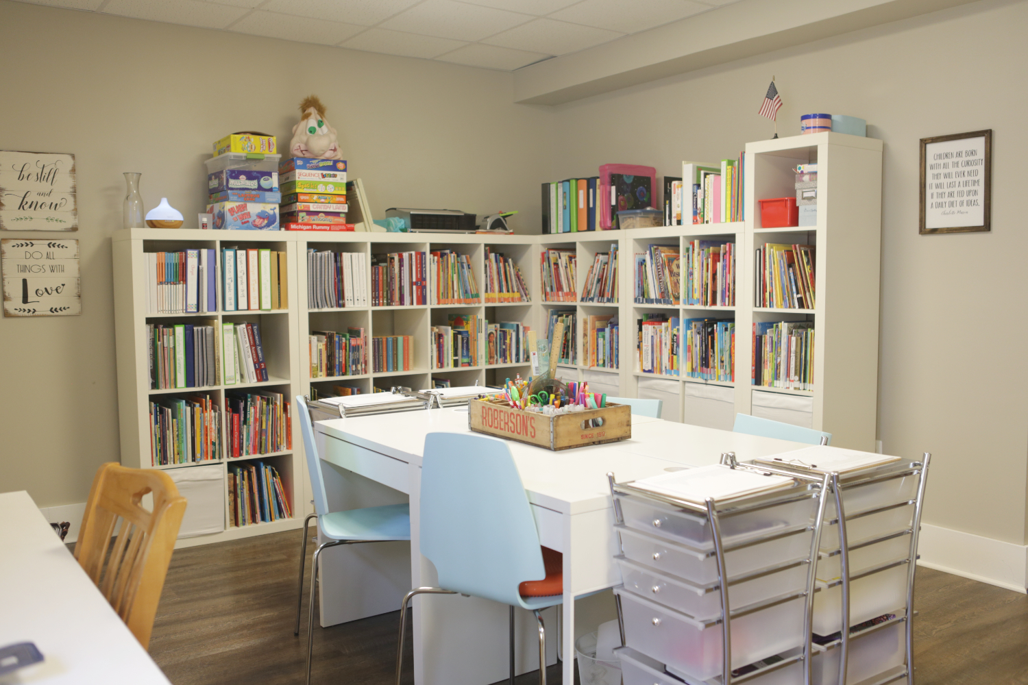 In 2018, a basement flood prompted me to give the space a makeover. Using just about all of the same furniture, the room was updated to reflect the growing ages of my students. No longer needing a lot of storage for toys, the Ikea cubbies now serve as our homeschool library. The walls are lightened up and subdued with neutral paint, and some of the more colorful furniture has been made-over with spray paint. Side note: I love spray paint. Additions of a few farmhouse decor pieces to the walls give the space a more grown-up feel. A chalk-painted hand-me-down desk provides me a grown-up teacher desk. It was one of those heavy particle board government desks in its previous life – amazing how much new life a bit of chalk paint can provide! And I even have file cabinet drawers now. The organizer in me explodes with satisfaction at the thought of functional storage. Truly, what more could I possibly need?