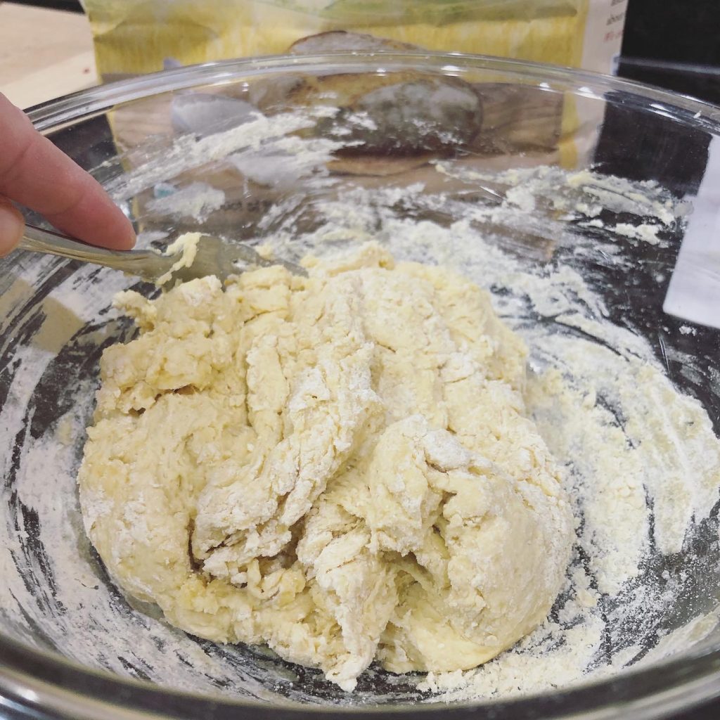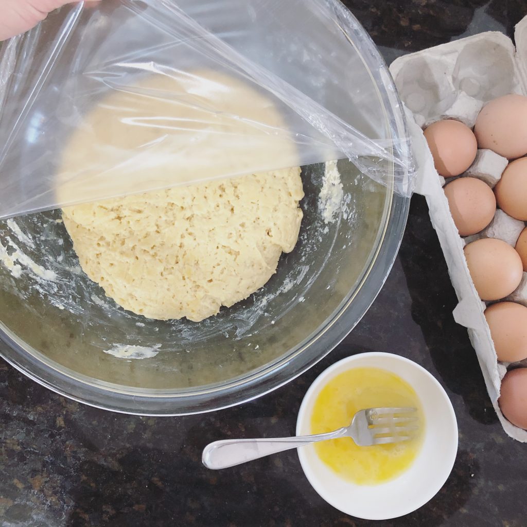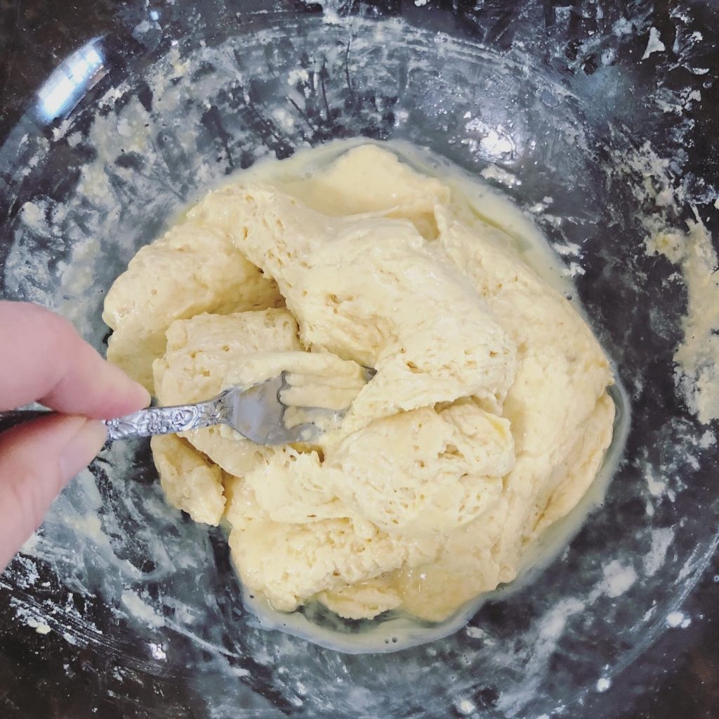 - Add the whisked egg into the dough and mix with a fork. The dough will be wet and sticky.