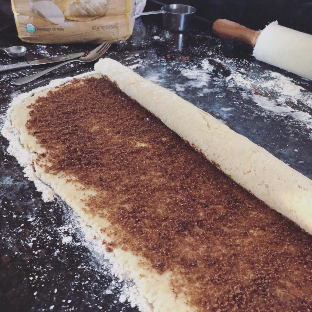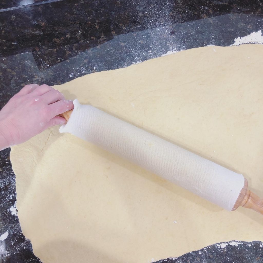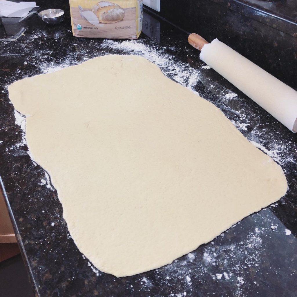 - Making sure that your work surface is liberally-floured, roll out the dough to approximately 24 inches by 12 inches in size.