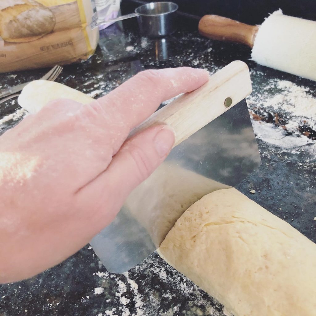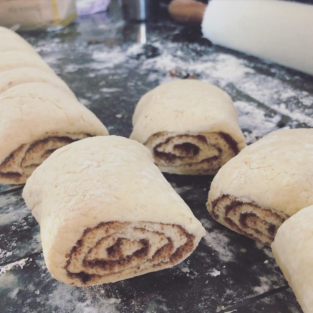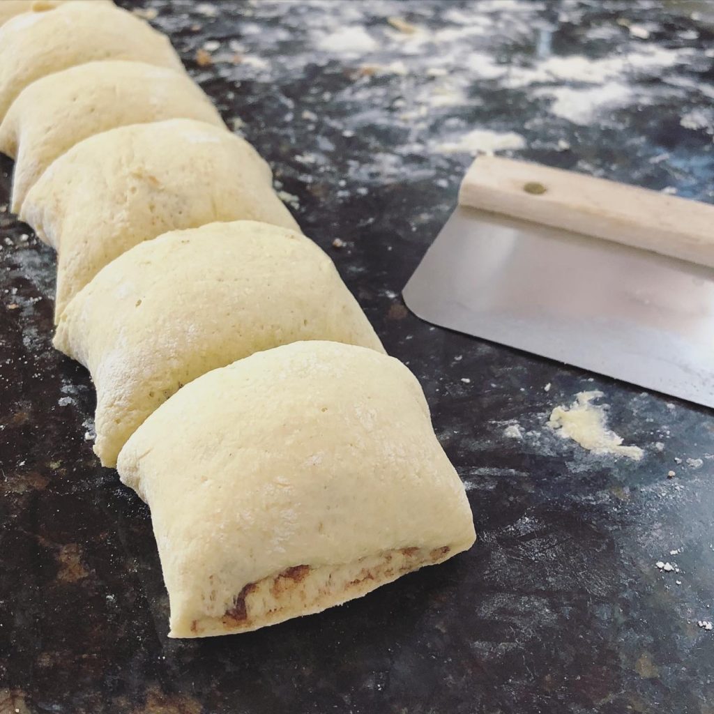 - Next, cut the rolls with a bread cutter. I like to cut them smaller because ... well, frankly, no one needs a humongous piece of cinnamon roll! Ha! I usually cut off the ends as tiny bonus pieces, and cut the rest of the roll into 14 pieces. That ultimately results in 16 pieces total, with two of them being tinier little guys. I've experimented with different numbers, but have found that cutting more pieces allows for reasonable portion sizes that don't leave everyone feeling yucky after eating.
